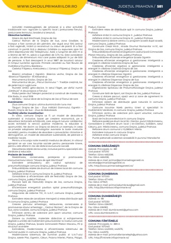 WWW.GHIDULPRIMARIILOR.RO JUDE%u021aUL PRAHOVA / 581 Activit%u0103%u021bi me%u0219tesug%u0103re%u0219ti, de artizanat %u0219i a altor activit%u0103%u021bi tradi%u021bionale non %u2013agricole cu specific local ( prelucrarea fierului, prelucrarea lemnului, brodatul %u0219i %u021besutul).Obiective turistice:Moara de Ap%u0103 Warthiadi, Drajna de JosCastrul Roman de la Drajna de Sus, zona Gradi%u0219te, la %u00eenceput a fost construit din p%u0103m%u00e2nt, dar dup%u0103 anul 106 castrul a fost reg%u00e2ndit, %u00eent%u0103rit %u0219i reconstruit cu ziduri de piatr%u0103. El a fost construit %u00een pant%u0103 lin%u0103 a dealului Gr%u0103di%u0219te cu expunere spre SV c%u0103tre depresiunea V%u0103ii Teleaj%u0103nului. Avea o lungime de 200 m %u0219i o l%u0103%u021bime de 187 m, adic%u0103 o suprafa%u021b%u0103 de 3,74 ha. Este considerat un castru de dimensiuni mici care putea ad%u0103posti %u00een jur de 500 de persone. A fost descoperit %u00een anul 1887 de locuitorii satului %u00een timpul lucr%u0103rilor agricole. Primele cercet%u0103ri au fost f%u0103cute de %u00eenv%u0103%u021b%u0103torul Dumitru BasilescuCastelul Filipescu Kretzulescu ( Conacul Filipescu) Drajna de JosBiserici ortodoxe ( Ogretin- Biserica veche, Drajna de Jos -Biserica Filipe%u0219tilor- Sf.Alexandru)Monumentul Eroilor, Drajna de JosMonumentul de pe ,, Piscul Domnului %u2018%u2019- Tradi%u021bie cre%u0219tin%u0103, loc de pelerinaj %u0219i rug%u0103ciuneRuinele cet%u0103%u021bii geto-dacice, %u00een satul F%u0103get, pe v%u00e2rful numit ,,Cet%u0103%u021buia%u2019%u2019-A doua epoca a fieruluiPodul peste r%u00e2ul Teleajen proiectat %u0219i construit de marele ing. Elie Radu, %u00een anul 1918S%u0103r%u0103%u021belu %u2013 Izorul s%u0103rat de la Drajna de Jos %u0219i filonul de sareEvenimente:Ziua comunei Drajna: ultima duminic%u0103%u00a0din luna maiT%u00e2rguri: Drajna de Jos %u2013 Ziua In%u0103l%u021b%u0103rii Domnului; Ogretin %u2013 Rusalii, Drajna de Sus %u2013 Ziua de Boboteaz%u0103.Facilit%u00e3%u0163i oferite investitorilor:%u00cen viitor, comuna Drajna va fi un model de dezvoltare sustenabil %u0219i inclusive, bazat pe cre%u0219tere economic%u0103, pe o dezvoltare teritorial%u0103 echilibrat%u0103, care asigur%u0103 tuturor cet%u0103%u021benilor acces echitabil la servicii publice moderne, la educa%u021bie %u0219i oportunit%u0103%u021bi. Ne dorim ca Drajna s%u0103 devin%u0103 un exemplu %u00een ceea ce prive%u0219te adoptarea tehnologiilor avansate la toate nivelurile societ%u0103%u021bii, pentru modelul de abordare a provoc%u0103rilor climatice si demografice, un model de dezvoltare sustenabil%u0103, de p%u0103strare a tradi%u021biilor locale.Pentru a %u00eencuraja noile investi%u021bii mediului de afaceri, %u00een viitorul apropiat se vor crea locuin%u021be sociale pentru persoanele tinere, pentru cele aflate %u00een risc de s%u0103r%u0103cie excluziune social%u0103Dezvoltarea re%u021belei de locuin%u021be, inclusive pentru speciali%u0219tii din s%u0103n%u0103tate %u0219i educa%u021bie.Proiecte de investi%u0163ii:Reabilitarea, conservarea, protejarea %u0219i promovarea monumentului istoric %u201cMoara de ap%u0103 Warthiadi%u201dExtindere ambulatoriu din cadrul spitalului de pneumoftiziologie comuna Drajna, jude%u021bul Prahova%u00cembun%u0103t%u0103%u021birea re%u021belei de drumuri de interes local din comuna Drajna, jude%u021bul PrahovaAsfaltare str%u0103zi %u00een comuna Drajna III, jude%u021bul PrahovaConsolidare %u0219i eficientizare sal%u0103%u00a0 de festivit%u0103%u021bi Drajna de Jos, comuna Drajna, jude%u021bul PrahovaParcare Sal%u0103%u00a0 de Festivit%u0103%u021bi Drajna de Jos, comuna Drajna, jude%u021bul PrahovaEficientizare energetic%u0103 pavilion spital pneumoftiziologie, comuna Drajna, jude%u021bul PrahovaAsigurarea de sisteme TIC, %u00een U.A.T, comuna Drajna, jude%u021bul PrahovaExtindere re%u021bea de canalizare menajer%u0103 %u0219i re%u021bea distribu%u021bie ap%u0103 %u00een comuna Drajna, jude%u021bul PrahovaCrearea parcului arheologic, restaurarea, conservarea %u0219i promovarea sitului arheologic ,, Castrul Roman%u2018%u2019, de la Drajna de Sus, zona Gradi%u0219te, comuna Drajna, jude%u021bul Prahova%u00cenfiin%u021bare centru de colectare prin aport voluntar, comuna Drajna, judetul PrahovaDotare cu mobilier, materiale didactice %u0219i echipamente digitale a unit%u0103%u021bii de %u00eenv%u0103%u021b%u0103m%u00e2nt preuniversitar la nivelul comunei Drajna, jude%u021bul Prahova, %u0218coala Gimnazial%u0103 Platon Mocanu, PJ %u0219i structuri acordateExtinderea, modernizarea %u0219i eficientizarea sistemului de iluminat public %u00een comuna Drajna, jude%u021bul PrahovaModernizarea sistemulu de iluminat public al U.A.T-ului Drajna, satele Plai, Ogretin, C%u0103tun, Poiana Mierlei, Piatra, Pi%u0219igoi, Poduri, CiocracExtindere re%u021bea de distribu%u021bie ap%u0103 %u00een comuna Drajna, jude%u021bul PrahovaAsfaltare str%u0103zi %u00een comuna Drajna II , jude%u021bul PrahovaAsfaltare str%u0103zi %u00een comuna Drajna III , jude%u021bul PrahovaModernizare %u0219i dotare centru cu program %u0219coal%u0103 dup%u0103 %u0219coal%u0103, comuna Drajna, jude%u021bul PrahovaConstruire Cre%u0219%u0103 Mic%u0103 , strada Drumul Romanilor nr.1C, sat Drajna de Jos, comuna Drajna, jude%u021bul Prahova%u00cembun%u0103t%u0103%u021birea eficien%u021bei energetice %u00een cadrul %u0218colii Gimnaziale Platon Mocanu, Drajna de Jos, jude%u021bul Prahova%u00cembun%u0103t%u0103%u021birea eficien%u021bei energetice %u0218coala OgretinCre%u0219terea eficien%u021bei energetice %u0219i gestionarea inteligent%u0103 a energiei %u00een cl%u0103direa Gradini%u021ba Drajna de SusCre%u0219terea eficien%u021bei ergetice %u0219i gestionarea inteligent%u0103 a energiei %u00een cl%u0103direa Gradini%u021ba Drajna de JosCre%u0219terea eficien%u021bei energetice %u0219i gestionarea inteligent%u0103 a energiei %u00een cl%u0103direa Dispensar OgretinCre%u0219terea eficien%u021bei energetice %u0219i gestionarea in