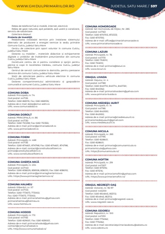 WWW.GHIDULPRIMARIILOR.RO JUDE%u021aUL SATU MARE / 597Re%u021bea de telefonie fix%u0103 %u0219i mobil%u0103, internet, electric%u0103Re%u021bea de gaze naturale, ap%u0103 potabil%u0103, ap%u0103 uzat%u0103 %u0219i canalizare, serviciu de salubrizare Colectare de%u0219euriProiecte de investi%u0163ii:Reabilitarea instala%u021biei termice prin instalarea sistemului alternativ de producere a energiei termice la sediu prim%u0103rie Comuna Culciu, jude%u021bul Satu MareCentru de colectare prin aport voluntar %u00een comuna Culciu, jude%u021bul Satu-MareDotarea cu mobilier , materiale didactice %u0219i echipamente digitale a unit%u0103%u021bilor de %u00eenv%u0103%u021b%u0103m%u00e2nt preuniversitar din comuna Culciu, jude%u021bul Satu-MareConstruire centru de zi pentru consiliere %u0219i sprijin pentru p%u0103rin%u0219i %u0219i copii %u00een localitatea C%u0103r%u0103seu, comuna Culciu, jude%u021bul Satu-MareCentrul de servicii comuniatre la domiciliu pentru persoane v%u00e2rsnice din comuna Culciu, jude%u021bul Satu-MareSta%u021bii de re%u00eenc%u0103rcare pentru vehicule electrice %u00een comuna Culciu, jude%u021bul Satu Mare Dotarea compartimentului administrativ %u0219i gospod%u0103rire comunal%u0103 al comunei Culciu, judetul Satu MareCOMUNA DOBAAdres%u0103: Principal%u0103, nr. 74Cod po%u0219tal: 447125Telefon: 0261-869115; Fax: 0261-869135; Adresa de e-mail: doba@sm.e-adm.roURL: www.comunadoba.roCOMUNA DOROLTAdres%u0103: PRINCIPAL%u0102, nr. 86Cod po%u0219tal: 447130Telefon: 0261-751238; Fax: 0261-751355; Adresa de e-mail: primar@primariadorolt.roURL: www.primariadorolt.roCOMUNA FOIENIAdres%u0103: Principal%u0103, nr. 469Cod po%u0219tal: 447135Telefon: 0261-874601, 874798; Fax: 0261-874601, 874798; Adresa de e-mail: contact@consiliullocalfoieni.roprimar@consiliullocalfoieni.roURL: www.consiliullocalfoieni.roCOMUNA GHER%u0162A MIC%u0102Adres%u0103: Principal%u0103, nr. 234Cod po%u0219tal: 447140Telefon: 0261-838229, 838108, 838010; Fax: 0261-838010; Adresa de e-mail: primar@primariaghertamica.roURL: https://www.primariaghertamica.ro/COMUNA HALMEUAdres%u0103: Eliber%u0103rii, nr. 57Cod po%u0219tal: 447145Telefon: 0261-773673, 773002; Fax: 0261-773673, 773002; Adresa de e-mail: primariahalmeu@yahoo.comprimariahalmeu@halmeu.roURL: www.halmeu.roCOMUNA HODODAdres%u0103: Principal%u0103, nr. 172Cod po%u0219tal: 447155Telefon: 0261-829001; Fax: 0261-829001; Adresa de e-mail: primariahodod@yahoo.comcontact@comunahodod.roURL: http://www.comunahodod.ro/COMUNA HOMOROADEAdres%u0103: Sat Homorodu de Mijloc, Nr. 285Cod po%u0219tal: 447163Telefon: 0261-870705, 872333; Fax: 0261-870705; Adresa de e-mail: office@primariahomoroade.ro URL: www.primariahomoroade.roCOMUNA LAZURIAdres%u0103: Principal%u0103, nr. 76Cod po%u0219tal: 447170Telefon: 0261-753210; Fax: 0261-753210; Adresa de e-mail: primaria@lazuri.roURL: www.lazuri.roORA%u0218UL LIVADAAdres%u0103: Oa%u015fului, nr. 4Cod po%u0219tal: 447180Telefon: 0261-840710, 840714, 840720; Fax: 0261-840362; Adresa de e-mail: primarialivadasm@yahoo.comURL: www.primaria-livada.roCOMUNA MEDIE%u015eU AURITAdres%u0103: Principal%u0103, nr. 14Cod po%u0219tal: 447185Telefon: 0261-842530; Fax: 0261-842530; Adresa de e-mail: primaria@mediesuaurit.roprimariamediesuaurit@gmail.comURL: www.mediesuaurit.roCOMUNA MICULAAdres%u0103: Principal%u0103, nr. 293Cod po%u0219tal: 447195Telefon: 0261-828601; Fax: 0261-828601; Adresa de e-mail: primaria@comunamicula.roprimariamicula@yahoo.comURL: https://comunamicula.ro/COMUNA MOFTINAdres%u0103: Principal%u0103, nr. 219Cod po%u0219tal: 447207Telefon: 0261-875116; Fax: 0261-875116; Adresa de e-mail: primariamoftin@yahoo.comURL: https://www.primariamoftin.ro/ORA%u0218UL NEGRE%u015eTI OA%u015eAdres%u0103: Victoriei, nr. 95-97Cod po%u0219tal: 445200Telefon: 0261-854845, 853112; Fax: 0261-854845, 853112; Adresa de e-mail: primarie@negresti-oas.roURL: www.negresti-oas.roCOMUNA ODOREUAdres%u0103: Republicii, nr. 100Cod po%u0219tal: 447210Telefon: 0261-775062; Fax: 0261-775062; Adresa de e-mail: secretariatprimariaodoreu@odoreu.roURL: www.odoreu.ro