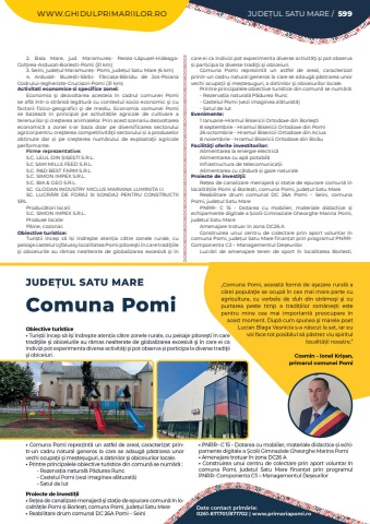 WWW.GHIDULPRIMARIILOR.RO JUDE%u021aUL SATU MARE / 5992. Baia Mare, jud. Maramure%u0219- Recea-L%u0103pu%u0219el-HideagaCol%u021birea-Ardusat-Borle%u0219ti-Pomi (31 km)3. Seini, jude%u021bul Maramure%u0219- Pomi, jude%u021bul Satu Mare (6 km) 4. Ardusat- Buze%u0219ti-S%u00e2rbi- F%u0103rca%u0219a-B%u00e2rs%u0103u de Jos-Poiana Codrului-Iegheri%u0219te-Cruci%u0219ori-Pomi (31 km)Activitati economice si specifice zonei:Economia %u015fi dezvoltarea acesteia %u00een cadrul comunei Pomi se afl%u0103 %u00eentr-o str%u00e2ns%u0103 leg%u0103tur%u0103 cu contextul socio economic %u015fi cu factorii fizico-geografici %u015fi de mediu. Economia comunei Pomi se bazeaz%u0103 %u00een principal pe activit%u0103%u021bile agricole de cultivare a terenurilor %u015fi cre%u015fterea animalelor. Prin acest scenariu dezvoltarea economic%u0103 a zonei s-ar baza doar pe diversificarea sectorului agricol pentru%u00a0cre%u015fterea competitivit%u0103%u0163ii sectorului %u0219i a produselor ob%u021binute dar %u0219i pe cre%u015fterea num%u0103rului de exploata%u0163ii agricole performante.Firme reprezentative:S.C. LEUL DIN %u0218I%u0218E%u0218TI S.R.L.S.C SAM MILLS FEED S.R.L.S.C. R&D BEST FARM S.R.LS.C. SIMON IMPEX S.R.L.S.C. BIA & GEO S.R.L.SC. GLODAN INDUSTRY MICLUS MARIANA LUMINITA I.ISC. LUCR%u0102RI DE FORAJ SI SONDAJ PENTRU CONSTRUCTII SRLProduc%u0103tori locali:S.C. SIMON IMPEX S.R.L.Produse locale: P%u00e2ine, cozonac Obiective turistice:Turi%u0219tii %u00eencep s%u0103 %u00ee%u0219i %u00eendrepte aten%u021bia c%u0103tre zonele rurale, cu peisaje castelul%u00a0Ujfalussy localitatea Pomi pitore%u015fti %u00een care tradi%u0163iile %u015fi obiceiurile au r%u0103mas nealterate de globalizarea excesiv%u0103 %u015fi %u00een care ei ca indivizi pot experimenta diverse activit%u0103%u0163i %u015fi pot observa %u0219i participa la diverse tradi%u0163ii %u015fi obiceiuri.Comuna Pomi reprezint%u0103 un astfel de areal, caracterizat printr-un cadru natural generos la care se adaug%u0103 p%u0103strarea unor vechi ocupa%u0163ii %u015fi me%u0219te%u0219uguri, a datinilor %u015fi obiceiurilor locale.Printre principalele obiective turistice din comun%u0103 se num%u0103r%u0103:-%u00a0Rezerva%u021bia natural%u0103 P%u0103durea Runc-%u00a0Castelul Pomi (vezi imaginea al%u0103turat%u0103)-%u00a0Satul de lutEvenimente:1 Ianuarie-Hramul Bisericii Ortodoxe din Borle%u015fti8 septembrie - Hramul Bisericii Ortodoxe din Pomi26 octombrie - Hramul Bisericii Ortodoxe din Aciua 8 noiembrie - Hramul Bisericii Ortodoxe din Bic%u0103uFacilit%u00e3%u0163i oferite investitorilor:Alimentarea la energie electric%u0103Alimentarea cu ap%u0103 potabil%u0103Infrastructura de telecomunica%u021biiAlimentarea cu c%u0103ldur%u0103 %u0219i gaze naturaleProiecte de investi%u0163ii:Re%u021bea de canalizare menajer%u0103 %u0219i sta%u021bie de epurare comun%u0103 %u00een localit%u0103%u021bile Pomi %u0219i Borle%u0219ti, comuna Pomi, jude%u021bul Satu MareReabilitare drum comunal DC 26A Pomi %u2013 Seini, comuna Pomi, jude%u021bul Satu MarePNRR%u2013 C 15 - Dotarea cu mobilier, materiale didactice %u0219i echipamente digitale a %u0218colii Gimnaziale Gheorghe Marina Pomi, jude%u021bul Satu MareAmenajare trotuar %u00een zona DC26 AConstruirea unui centru de colectare prin aport voluntar %u00een comuna Pomi, jude%u021bul Satu Mare finan%u021bat prin programul PNRRComponenta C3 %u2013 Managementul De%u0219eurilorLucr%u0103ri de amenajare teren de sport %u00een localitatea Borlesti,