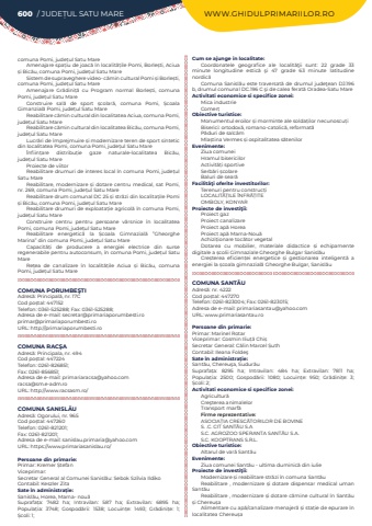 600 / JUDE%u021aUL SATU MARE WWW.GHIDULPRIMARIILOR.ROcomuna Pomi, jude%u021bul Satu MareAmenajare spa%u021biu de joac%u0103 %u00een localit%u0103%u021bile Pomi, Borle%u0219ti, Aciua %u0219i Bic%u0103u, comuna Pomi, jude%u021bul Satu MareSistem de supraveghere video- c%u0103min cultural Pomi %u0219i Borle%u0219ti, comuna Pomi, jude%u021bul Satu MareAmenajare Gr%u0103dini%u021b%u0103 cu Program normal Borle%u0219ti, comuna Pomi, jude%u021bul Satu MareConstruire sal%u0103 de sport %u0219colar%u0103, comuna Pomi, %u0218coala Gimanzial%u0103 Pomi, jude%u021bul Satu MareReabilitare c%u0103min cultural din localitatea Aciua, comuna Pomi, jude%u021bul Satu MareReabilitare c%u0103min cultural din localitatea Bic%u0103u, comuna Pomi, jude%u021bul Satu MareLucr%u0103ri de %u00eemprejmuire %u0219i modernizare teren de sport sintetic din localitatea Pomi, comuna Pomi, jude%u021bul Satu Mare%u00cenfiin%u021bare distribu%u021bie gaze naturale-localitatea Bic%u0103u, jude%u021bul%u00a0Satu MareProiecte de viitorReabilitare drumuri de interes local %u00een comuna Pomi, jude%u021bul Satu MareReabilitare, modernizare %u0219i dotare centru medical, sat Pomi, nr. 269, comuna Pomi, jude%u021bul Satu MareReabilitare drum comunal DC 25 %u0219i str%u0103zi din localita%u021bile Pomi %u0219i Bic%u0103u, comuna Pomi, jude%u021bul Satu MareReabilitare drumuri de exploata%u021bie agricol%u0103 %u00een comuna Pomi, jude%u021bul Satu MareConstruire centru pentru persoane v%u00e2rsnice %u00een localitatea Pomi, comuna Pomi, jude%u021bul Satu MareReabilitare energetic%u0103 la %u0218coala Gimnazial%u0103 %u201dGheorghe Marina%u201d din comuna Pomi, jude%u021bul Satu MareCapacit%u0103%u021bi de producere a energiei electrice din surse regenerabile pentru autoconsum, %u00een comuna Pomi, jude%u021bul Satu MareRe%u021bea de canalizare %u00een localit%u0103%u021bile Aciua %u0219i Bic%u0103u, comuna Pomi, jude%u021bul Satu MareCOMUNA PORUMBE%u015eTIAdres%u0103: Principal%u0103, nr. 17CCod po%u0219tal: 447152Telefon: 0361-525288; Fax: 0361-525288; Adresa de e-mail: secretar@primariaporumbesti.roprimar@primariaporumbesti.roURL: http://primariaporumbesti.roCOMUNA RAC%u015eAAdres%u0103: Principala, nr. 494Cod po%u0219tal: 447224Telefon: 0261-826851; Fax: 0261-856851; Adresa de e-mail: primariaracsa@yahoo.comracsa@sm.e-adm.roURL: http://www.racsasm.ro/COMUNA SANISL%u0102UAdres%u0103: Ogorului, nr. 965Cod po%u0219tal: 447260Telefon: 0261-821201; Fax: 0261-821201; Adresa de e-mail: sanislau.primaria@yahoo.comURL: https://www.primariasanislau.ro/Persoane din primarie:Primar: Kremer %u0218tefanViceprimar:%u00a0Secretar General al Comunei Sanisl%u0103u: Sebok Szilvia IldikoContabil: Keszler ZitaSate %u00een administra%u021bie:Sanisl%u0103u, Horea, Marna- nou%u0103Suprafa%u021ba:%u00a0 7482 ha; Intravilan:%u00a0 587 ha; Extravilan:%u00a0 6895 ha; Popula%u021bia:%u00a0 3748; Gospod%u0103rii:%u00a0 1538; Locuin%u021be:%u00a0 1493; Gr%u0103dini%u021be:%u00a0 1; %u0218coli:%u00a01; Cum se ajunge in localitate:Coordonatele geografice ale localit%u0103%u0163ii sunt: 22 grade 33 minute longitudine estic%u0103 %u015fi 47 grade 63 minute latitudine nordic%u0103Comuna Sanisl%u0103u este traversat%u0103 de drumul jude%u0163ean DJ.196 b, drumul comunal DC.196 C %u015fi de calea ferat%u0103 Oradea-Satu MareActivitati economice si specifice zonei:Mica industrieComer%u021bObiective turistice:Monumentul eroilor %u0219i morminte ale solda%u021bilor necunoscu%u021biBiserici: ortodox%u0103, romano-catolic%u0103, reformat%u0103P%u0103duri de salc%u00e2mMla%u0219tina Vermes %u0219i ospitalitatea s%u0103tenilorEvenimente:Ziua comuneiHramul bisericilorActivit%u0103%u021bi sportiveSerb%u0103ri %u0219colareBaluri de sear%u0103Facilit%u00e3%u0163i oferite investitorilor:Terenuri pentru construc%u021biLOCALIT%u0102%u021aILE %u00ceNFR%u0102%u021aITEOMBOLY, KONYARProiecte de investi%u0163ii:Proiect gazProiect canalizareProiect ap%u0103%u00a0HoreaProiect ap%u0103%u00a0Marna-Nou%u0103Achizi%u021bionare toc%u0103tor vegetalDotarea cu mobilier, materiale didactice %u0219i echipamente digitale a %u0219colii Gimnaziale Gheorghe Bulgar Sanisl%u0103uCre%u0219terea eficien%u021bei energetice %u0219i gestionarea inteligent%u0103%u00a0 a energiei la %u0219coala gimnazial%u0103%u00a0Gheorghe Bulgar, Sanisl%u0103uCOMUNA SANT%u0102UAdres%u0103: nr. 4222Cod po%u0219tal: 447270Telefon: 0261-823004; Fax: 0261-823015; Adresa de e-mail: primariasantau@yahoo.comURL: www.primariasantau.roPersoane din primarie:Primar: Marinel RotarViceprimar: Cosmin Iliu%u021b%u0103 Chi%u0219Secretar General: C%u0103lin Marcel %u0218uthContabil: Ileana Folde%u015fSate %u00een administra%u021bie:Sant%u0103u, Chereu%u015fa, Sudur%u0103uSuprafa%u021ba:%u00a0 8295 ha; Intravilan:%u00a0 484 ha; Extravilan:%u00a0 7811 ha; Popula%u021bia:%u00a0 2500; Gospod%u0103rii:%u00a0 1080; Locuin%u021be:%u00a0 950; Gr%u0103dini%u021be:%u00a0 3; %u0218coli:%u00a02; Activitati economice si specifice zonei:Agricultur%u0103Cre%u015fterea animalelorTransport marf%u0103Firme reprezentative:ASOCIA%u021aIA CRESC%u0102TORILOR DE BOVINES. .C. CIT SANT%u0102U S.AS.C. AGROZOO SPERANTA SANT%u0102U S.A. S.C. KOOPTRANS S.R.L.%u00a0Obiective turistice:Altarul de var%u0103 Sant%u0103uEvenimente:Ziua comunei Sant%u0103u - ultima duminic%u0103 din iulieProiecte de investi%u0163ii:Modernizare %u0219i reabilitare str%u0103zi %u00een comuna Sant%u0103uReabilitare , modernizare %u0219i dotare dispensar medical uman Sant%u0103uReabilitare , modernizare %u0219i%u00a0dotare c%u0103mine cultural %u00een Sant%u0103u %u0219i Chereu%u0219aAlimentare cu ap%u0103/canalizare menajer%u0103 %u0219i sta%u021bie de epurare %u00een localitatea%u00a0Chereu%u0219a