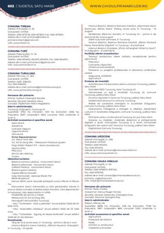 602 / JUDE%u021aUL SATU MARE WWW.GHIDULPRIMARIILOR.ROCOMUNA TIREAMAdres%u0103: Principal%u0103, nr. 25Cod po%u0219tal: 447325Telefon: 0261-873718, 0261-873601; Fax: 0261-873601; Adresa de e-mail: primaria@tiream.roprimaria.tiream@gmail.comURL: www.tiream.roCOMUNA TUR%u0162Adres%u0103: Pia%u0163a Eroilor, nr. 18Cod po%u0219tal: 447330Telefon: 0261-834672, 834575, 834574; Fax: 0261-834574; Adresa de e-mail: primariaturt@yahoo.comURL: www.primariaturt.roCOMUNA TURULUNGAdres%u0103: Parcului, nr. 260Cod po%u0219tal: 447335Telefon: 0261- 836001; Fax: 0261-836100; Adresa de e-mail: primaria@primariaturulung.roURL: www.primariaturulung.roPersoane din primarie:Primar: Gy%u00e1kon Gheorghe NicolaeSecretar General: Nezezon KlaraContabil: Tepfenh%u00e1rt M%u00e1ria MagdalenaSate %u00een administra%u021bie:Turulung, Dr%u0103gu%u015feni, Turulung ViiSuprafa%u021ba:%u00a0 5764 ha; Intravilan:%u00a0 1201 ha; Extravilan:%u00a0 4566 ha; Popula%u021bia:%u00a0 3587; Gospod%u0103rii:%u00a0 1650; Locuin%u021be:%u00a0 1550; Gr%u0103dini%u021be:%u00a0 3; %u0218coli:%u00a02; Activitati economice si specifice zonei:Agricultur%u0103ZootehniaCultivare c%u0103p%u015funiLegumicultur%u0103 Viticultur%u0103Firme Reprezentative:S.C. Rotur-Com SRLS.C. Erli & Geng SRL %u2013 Restaurant Pizzerue QueenFeigi Zolt%u00e1n-Robert P.F. %u2013 Kevin AutoserviceOportunit%u0103%u0163i:PescuitulServicii de cateringTurism%u00a0Obiective turistice:Biserica romano%u00a0catolic%u0103 - monument istoricBiserica reformat%u0103 - monument istoricCastelul Per%u00e9nyi - monument istoricBiserica greco catolic%u0103Capela Sf%u00e2ntul DonathCasa memorial%u0103 - episcop Reizer P%u00e1lBalt%u0103 de pescuitNatura 2000, zon%u0103 natural%u0103 protejat%u0103 cursul inferior al R%u00e2ului TurMonument istoric memorabil cu lista persoanelor c%u0103zute %u00een primul r%u0103zboi mondial, al doilea r%u0103zboi mondial. Lista deporta%u021biilor %u00een holocaust, lista deporta%u021biilor %u00een URSSPosibilit%u0103%u021bi de servire a mesei:Restaurant SC Erli & Geng SRLMonografii ale localit%u0103%u021bii Turulung:- titlu: %u201cT%u00farterebes - M%u00falt a jelenben%u201d anual edit%u0103rii 2002 de Dl. Elek Imre- titlu: %u201cAvasvid%u00e9ki utikalauz%u201d anual edit%u0103rii 2005 de Dl. Elek Imre%u00a0- titlu: %u201cT%u00farterebes - Egyh%u00e1y %u00e9s Iskola t%u00f6rt%u00e9nete%u201d anual edit%u0103rii 2009 de Dl. Kis K%u00e1lm%u00e1nEvenimente:T%u00e2rg de %u021aar%u0103, acces auto, %u00een Turulung %u2013 prima zi de joi a luniiHramul Bisericii Greco-Catolice, %u201eSf%u00e2ntul Mucenic Gheorghe%u201d, %u00een Turulung %u2013 23 aprilieHramul Bisericii, Biserica Romano-Catolic%u0103 %u201eAdormirea Maicii Domnului, Sf%u00e2nta Maria%u201d Kirbaly, acces auto, %u00een Turulung %u2013 15 AugustS%u0103rb%u0103torea Sf%u00e2ntului Donath, %u00een Turulung Vii %u2013 prima zi de duminic%u0103 din luna augustZilele Culturale Germane, %u00een TurulungHramul Bisericii, Biserica Romano-Catolic%u0103 %u201eSf%u00e2nta Fecioar%u0103 Maria, Pream%u0103rita St%u0103p%u00e2n%u0103%u201d, %u00een Turulung %u2013 8 octombrie Hramul Bisericii Ortodoxe %u201eSfin%u021bii Arhangheli Mihail %u0219i Gavril%u201d, %u00een Dr%u0103gu%u0219eni %u2013 8 noiembrie.Facilit%u00e3%u0163i oferite investitorilor:Terenuri productive, libere calitativ, excep%u021bionale pentru agricultur%u0103PescuitulCultivarea c%u0103p%u0219unilorInfrastructur%u0103 existent%u0103Persoane cu preg%u0103tiri profesionale %u00een domeniul confec%u021biilor u%u0219oareAsigurarea utilit%u0103%u021bilorAgricultur%u0103Proiecte de investi%u0163ii:Achizi%u021bionare miniexcavator pentru comuna Turulung, jude%u021bul Satu MareExtindere RED Turulung, zona Turulung ViiAlimentarea cu ap%u0103 a localit%u0103%u021bii Turulung Vii, comuna Turulung, jude%u021bul Satu MareDrumuri agricole %u00een comuna Turulung, jude%u021bul Satu MareModernizare drumuri %u00een comuna TurulungRe%u021bele de canalizare menajer%u0103%u00a0 %u00een localitatea Dr%u0103gu%u0219eni, comuna Turulung, jude%u021bul Satu Mare Gestionarea inteligent%u0103 a energiei la cl%u0103direa: A%u0219ez%u0103m%u00e2nt cultural %u00een localitatea Dr%u0103gu%u0219eni, comuna Turulung, jude%u021bul Satu Mare%u00cenfiin%u021bare centru multicultural Turulung Vii, jud. Satu MareDotarea cu mobilier, materiale didactice %u0219i echipamente digitale a %u0218colii Gimnaziale Turulung %u0219i a %u0218colii Gimnaziale Dr%u0103gu%u0219eni din cadrul UAT Comuna Turulung, jude%u021bul Satu Mare%u00a0Digitalizare Comuna TurulungCOMUNA URZICENIAdres%u0103: Principal%u0103, nr. 238Cod po%u0219tal: 447340Telefon: 0261-874215; Fax: 0261-874215; Adresa de e-mail: primaria@comunaurziceni.roURL: www.comunaurziceni.roCOMUNA VALEA VINULUIAdres%u0103: Principal%u0103, nr. 63Cod po%u0219tal: 447345Telefon: 0261-876870, 876746; Fax: 0261-876705; Adresa de e-mail: contact@primariavaleavinului.roprimaria_vv@yahoo.comURL: https://primariavaleavinului.ro/Persoane din primarie:Primar: Radu CristeaViceprimar: Marius Roger FerneaSecretar General: Alexandru Gheorghe OrosContabil: Maricica Georgeta PopSate %u00een administra%u021bie:Ro%u015fiori, M%u0103riu%u015f, S%u00e2iSuprafa%u021ba:%u00a0 8836 ha; Intravilan:%u00a0 1128 ha; Extravilan:%u00a0 7708 ha; Popula%u021bia:%u00a0 1967; Gospod%u0103rii:%u00a0 889; Locuin%u021be:%u00a0 1025; Gr%u0103dini%u021be:%u00a0 4; %u0218coli:%u00a04; Activitati economice si specifice zonei:Agricultur%u0103Produc%u0163ie de c%u0103rbuniPale%u0163iComer%u0163 cu am%u0103nuntulCre%u015fterea animalelor
