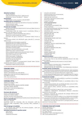 WWW.GHIDULPRIMARIILOR.RO JUDE%u021aUL SATU MARE / 603Obiective turistice:Muzeul CodruluiCasa memorial%u0103 Alois T%u0103utu, Valea VinuluiM%u0103n%u0103stirea %u201cIzvorul T%u0103m%u0103duirii%u201d - M%u0103riu%u015fEvenimente:T%u00e2rg de %u0163ar%u0103 - lunar, %u00een prima zi de s%u00e2mb%u0103t%u0103Facilit%u00e3%u0163i oferite investitorilor:Posibilit%u0103%u0163i de achizi%u0163ionare de terenuri la pre%u0163uri accesibileTeleviziune prin cabluRe%u0163ea de telefonie fix%u0103 %u015fi mobil%u0103Proiecte de investi%u0163ii:Modernizare str%u0103zi de interes local %u00een comuna Valea Vinului %u0219i satele apar%u021bin%u0103toareModernizare str%u0103zi de interes local %u00een localitatea M%u0103riu%u0219 %u0219i Ro%u0219iori %u0219i DC 92 Valea Vinului-S%u00e2iAlimentare cu ap%u0103 %u00een localitatea S%u00e2i %u0219i M%u0103riu%u0219Reabilitare, dotare dispensar medicalExtindere de ap%u0103 %u0219i canalizare %u00een localitatea Valea Vinului %u0219i Ro%u0219iori%u00cenfiin%u021barea sistem de distribu%u021bie gaze naturale %u00een comuna Valea VinuluiReabilitare termic%u0103 cl%u0103dire %u0219coal%u0103 S%u00e2iReabilitare termic%u0103 cl%u0103dire %u0219coal%u0103 M%u0103riu%u0219Reabilitare %u0219coal%u0103 veche Valea VinuluiRepara%u021bii interioare %u0219i exterioare %u0219coala Ro%u0219ioriExtindere iluminat publicRepara%u021bii interioare biblioteca comunal%u0103Reabilitare c%u0103min cultural Ro%u0219ioriPlanul urbanistic general al comunei Valea VinuluiSal%u0103 de sport %u00een comuna Valea VinuluiAsigurarea infrastructuri TICPlanuri parcelare + %u00eent%u0103bulareAchizi%u021bie ma%u0219in%u0103 de dez%u0103pezireReabilitare garaje dispensar%u00cemprejmuire %u0219coal%u0103 S%u00e2iDotare cu mobilier %u0219i echipamente: %u0218coal%u0103 Valea Vinului, Gr%u0103dini%u021b%u0103 Valea Vinului, Gr%u0103dini%u021b%u0103 S%u00e2i Reabilitare cl%u0103dire anex%u0103 prim%u0103rieCOMUNA VAMAAdres%u0103: Tineretului, nr. 803Cod po%u0219tal: 447350Telefon: 0261-857001; Fax: 0261-857161; Adresa de e-mail: primariavama@yahoo.comvama@sm.e-adm.roURL: www.vama-sm.roCOMUNA VETI%u015eAdres%u0103: Principal%u0103, nr. 263Cod po%u0219tal: 447355Telefon: 0261-820702, 806016, 820783, 820881; Fax: 0261- 806016, 820783; Adresa de e-mail: primaria@vetis.roURL: www.vetis.roPersoane din primarie:Primar:%u00a0Ionel Daniel CodreaViceprimar: Zoltan LiszkaiSecretar General: Anca Maria Pop%u00a0%u0218ef serviciu%u00a0buget ,contabilitate %u015fi investi%u021bii: Ana Cristina Checiche%u0219Sate %u00een administra%u021bie:Veti%u015f, Oar, DecebalSuprafa%u021ba:%u00a0 5429 ha; Intravilan:%u00a0 1154 ha; Extravilan:%u00a0 4275 ha; Popula%u021bia:%u00a0 5691; Gospod%u0103rii:%u00a0 3587; Locuin%u021be:%u00a0 1990; Gr%u0103dini%u021be:%u00a0 3; %u0218coli:%u00a04; Cum se ajunge in localitate:Din direc%u021bia Satu Mare sau din direc%u021bia Oradea - Carei, pe drumul na%u021bional DN 19AActivitati economice si specifice zonei:Agricultur%u0103Pomicultur%u0103Cre%u0219terea animalelorIndustria alimentar%u0103Aparatur%u0103 electric%u0103 %u0219i automatiz%u0103riPrelucrarea lemnuluiMateriale de construc%u021biiActivit%u0103%u021bi %u00een domeniul construc%u021biilorPrelucrare metaleCazare Turistic%u0103 Firme reprezentative:UNICARM SRL SC ENCODE PLUS ENERGY SRLIRON COMPANYAUTOMOTIVE REFINISH DISTRIBUTION SRLALFAMET STEEL SYSTEM SRLSAMINSTAL SRLDAMAR CONSULTING SRLROLSAN MEL SRLMANTA BROS SRLSTAHLPRES SRLFEROTEHNIC NORD-VEST SRL VLAD TEX SRLMANNINI SM SRLVIVATEX SRLEMBRYON CAPITAL INVESTMENT SRLATS ENERGY SRLTIP TOP BOB SRLBUSINESS TRANSACTION SRLBUENO LACT SRLFASTUS SRLMAMUT INVEST SRLWOODWORKS SRL AGRIDAV SRLObiective turistice:Monument istoric Biserica Reformat%u0103 Veti%u0219Lacuri mai mici %u0219i r%u00e2ul Some%u0219 reprezint%u0103 atrac%u021bii mai ales pentru pescari Expozi%u021bie de istorie local%u0103 la Centrul Cultural Veti%u0219Evenimente:Hramul Bisericii Ortodoxe Veti%u0219 %u2013 8 septembrieZiua localit%u0103%u021bilor Oar %u0219i Decebal S%u0103rb%u0103torirea zilei de 1 Decembrie - Ziua Na%u021bional%u0103 a Rom%u00e2nieiFacilit%u00e3%u0163i oferite investitorilor:Racordare facil%u0103 la re%u021belele de utilit%u0103%u021bi existente : ap%u0103, canalizare, gaze naturale, energie electric%u0103, acces la drumul na%u021bional DN19 A.Existen%u021ba Parcului industrial Renovatio Logistic ParcDrum expres de leg%u0103tur%u0103 Satu Mare cu autostrada M3 Ungaria, %u00een curs de realizare, cu nod de urcare %u2013 cobor%u00e2re %u00een comuna Veti%u0219Proiecte de investi%u0163ii:Realizarea re%u021belelor de ap%u0103 potabil%u0103 %u0219i canalizare %u00een localit%u0103%u021bile Decebal %u0219i Veti%u0219, comuna Veti%u0219Finalizarea moderniz%u0103rii str%u0103zilor %u00een localit%u0103%u021bile Veti%u0219 %u0219i Oar, comuna Veti%u0219Modernizarea str%u0103zilor din localitatea Decebal, comuna Veti%u0219Cre%u0219%u0103 %u00een localitatea Veti%u0219, comuna Veti%u0219Baz%u0103 sportiv%u0103 (teren, vestiare, parcare), %u00een localitatea Veti%u0219, comuna Veti%u0219Pist%u0103 pentru bicicli%u0219ti %u00een Veti%u0219 %u0219i Oar, comuna Veti%u0219Cadastrare sistematic%u0103: Actualizarea Planului Urbanistic General al comunei Veti%u0219Realizare capacit%u0103%u021bi de produc%u021bie de energie electric%u0103 din surse solare %u00een comuna Veti%u0219Amenajarea unui cabinet medical, a unui cabinet stomatologic %u0219i a unui punct farmaceutic %u00een localitatea Decebal, comuna Veti%u0219Extindere iluminat public %u00een localit%u0103%u021bile comunei Veti%u0219 Realizarea unor sta%u021bii de %u00eenc%u0103rcare cu energie pentru vehicule electrice %u00een Comuna Veti%u0219COMUNA VIILE SATU MAREAdres%u0103: Republicii, nr. 1Cod po%u0219tal: 447360Telefon: 0261-754224,0732-402818; Fax: 0261-754224; Adresa de e-mail: viilesm@yahoo.comURL: www.viilesatumare.ro