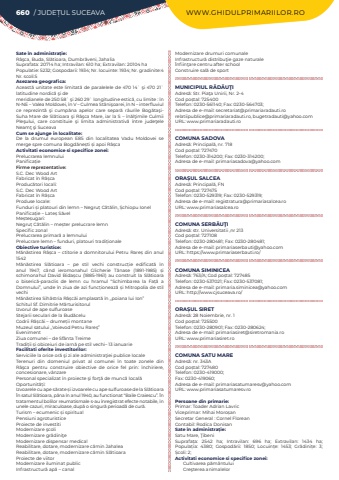 660 / JUDE%u021aUL SUCEAVA WWW.GHIDULPRIMARIILOR.ROSate %u00een administra%u021bie:R%u00e2%u015fca, Buda, Sl%u0103tioara, Dumbr%u0103veni, JahaliaSuprafata: 20714 ha; Intravilan: 610 ha; Extravilan: 20104 haPopulatie: 5232; Gospodarii: 1934; Nr. locuinte: 1934; Nr. gradinite:4Nr. scoli:5Asezarea geografica:Aceast%u0103 unitate este limitat%u0103 de paralelele de 470 14` %u015fi 470 21` latitudine nordic%u0103 %u015fi demeridianele de 250 58` %u015fi 260 29` longitudine estic%u0103, cu limite : %u00een N-NE %u2013 Valea Moldovei, %u00een V %u2013 Culmea St%u00e2ni%u015foarei, %u00een N %u2013 interfluviul ce reprezint%u0103 %u015fi cump%u0103na apelor care separ%u0103 r%u00e2urile Bog%u0103ta%u015fiSuha Mare de Sl%u0103tioara %u015fi R%u00e2%u015fca Mare, iar la S %u2013 %u00een%u0103l%u0163imile Culmii Ple%u015fului, care constituie %u015fi limita administrativ%u0103 %u00eentre jude%u0163ele Neam%u0163 %u015fi SuceavaCum se ajunge in localitate:De la drumul european E85 din localitatea Vadu Moldovei se merge spre comuna Bogd%u0103ne%u0219ti %u0219i apoi R%u00e2%u0219caActivitati economice si specifice zonei:Prelucrarea lemnuluiPanifica%u021bieFirme reprezentative:S.C. Dec Wood ArtFabricat %u00een R%u00e2%u0219caProduc%u0103tori locali:S.C. Dec Wood ArtFabricat %u00een R%u00e2%u0219caProduse locale:Funduri %u0219i platouri din lemn %u2013 Negru%u021b C%u0103t%u0103lin, %u0218chiopu IonelPanifica%u021bie %u2013 Late%u0219 S%u0103velMe%u0219te%u0219ugari:Negru%u021b C%u0103t%u0103lin %u2013 me%u0219ter prelucrare lemnSpecific zonalPrelucrarea primar%u0103 a lemnuluiPrelucrare lemn %u2013 funduri, platouri tradi%u021bionaleObiective turistice:M%u0103n%u0103stirea R%u00e2%u0219ca %u2013 ctitorie a domnitorului Petru Rare%u0219 din anul 1542M%u0103n%u0103stirea Sl%u0103tioara %u2013 pe stil vechi construc%u021bie edificat%u0103 %u00een anul 1947, c%u00e2nd ieromonahul%u00a0 Glicherie T%u0103nase%u00a0 (1891-1985) %u0219i schimonahul David Bida%u0219cu (1885-1961) au construit la Sl%u0103tioara o biseric%u0103-paraclis de lemn cu hramul %u201cSchimbarea la Fa%u021b%u0103 a Domnului%u201d, unde %u00een ziua de azi func%u021bioneaz%u0103 %u0219i Mitropolia de stil vechiM%u0103n%u0103stirea Sih%u0103stria R%u00e2%u0219c%u0103i amplasat%u0103 %u00een ,,poiana lui Ion%u201dSchitul Sf. Dimitrie M%u0103rturisitorulIzvorul de ape sulfuroaseStejarii seculari de la Bud%u0103celuCodrii R%u00e2%u0219c%u0103i %u2013 drume%u021bii montaneMuzeul satului ,,Voievod Petru Rare%u0219%u201dEvenimentZiua comunei %u2013 de Sf%u00e2nta TreimeTradi%u021bii %u0219i obiceiuri de iarn%u0103 pe stil vechi%u2013 13 ianuarieFacilitati oferite investitorilor:Serviciile la orice or%u0103 %u015fi zi ale administra%u0163iei publice localeTerenuri din domeniul privat al comunei %u00een toate zonele din R%u00e2%u015fca pentru construire obiective de orice fel prin: %u00eenchiriere, concesionare, v%u00e2nzarePersonal specializat %u00een proiecte %u015fi for%u0163%u0103 de munc%u0103 local%u0103Oportunit%u0103%u021bi:Izvoarele cu ape s%u0103rate %u0219i izvoarele cu ape sulfuroase de la Sl%u0103tioara%u00cen satul Sl%u0103tioara, p%u00e2na %u00een anul 1940, au functionat %u201cBaile Craiescu%u201d. %u00cen tratamentul bolilor reumatismale s-au %u00eenregistrat efecte notabile, %u00een unele cazuri, miraculoase, dup%u0103%u00a0o singur%u0103%u00a0perioad%u0103%u00a0de cur%u0103.Turism %u2013 ecumenic %u0219i spiritualPensiuni agroturisticeProiecte de investitiModernizare %u015fcoliModernizare gr%u0103dini%u0163eModernizare dispensar medicalReabilitare, dotare, modernizare c%u0103min JahaleaReabilitare, dotare, modernizare c%u0103min Sl%u0103tioaraProiecte de viitorModernizare iluminat publicInfrastructur%u0103 ap%u0103 %u2013 canalModernizare drumuri comunaleInfrastructur%u0103 distribu%u0163ie gaze naturale%u00cenfiin%u0163are centru after schoolConstruire sal%u0103 de sportMUNICIPIUL R%u0102D%u0102U%u0162IAdres%u0103: Str. Pia%u0163a Unirii, Nr. 2-4Cod po%u0219tal: 725400Telefon: 0230-561140; Fax: 0230-564703; Adresa de e-mail: secretariat@primariaradauti.rorelatiipublice@primariaradauti.ro, bugetradauti@yahoo.comURL: www.primariaradauti.roCOMUNA SADOVAAdres%u0103: Principal%u0103, nr. 718Cod po%u0219tal: 727470Telefon: 0230-314200; Fax: 0230-314200; Adresa de e-mail: primariasadova@yahoo.comORA%u0218UL SALCEAAdres%u0103: Principal%u0103, FNCod po%u0219tal: 727475Telefon: 0230-529319; Fax: 0230-529319; Adresa de e-mail: registratura@primariasalcea.roURL: www.primariasalcea.roCOMUNA SERB%u0102U%u0162IAdres%u0103: str. Universitatii ,nr 213Cod po%u0219tal: 727108Telefon: 0230-280481; Fax: 0230-280481; Adresa de e-mail: primariaserbauti@yahoo.comURL: https://www.primariaserbauti.ro/COMUNA SIMINICEAAdres%u0103: 763/A; Cod po%u0219tal: 727485Telefon: 0230-537021; Fax: 0230-537081; Adresa de e-mail: primaria.siminicea@yahoo.comURL: http://www.cjsuceava.ro/ORA%u0218UL SIRETAdres%u0103: 28 Noiembrie, nr. 1Cod po%u0219tal: 725500Telefon: 0230-280901; Fax: 0230-280624; Adresa de e-mail: primariasiret@siretromania.roURL: www.primariasiret.roCOMUNA SATU MARE Adres%u0103: nr. 343ACod po%u0219tal: 727480Telefon: 0230-419000; Fax: 0230-419060; Adresa de e-mail: primariasatumaresv@yahoo.comURL: www.primariasatumaresv.roPersoane din primarie:Primar:%u00a0Toader Adrian%u00a0Lavric%u00a0Viceprimar: Mihai%u00a0Moro%u0219anSecretar General : Cornel%u00a0Florean%u00a0Contabil: Rodica%u00a0DonisanSate %u00een administra%u021bie:Satu Mare, %u0162ibeniSuprafa%u021ba:%u00a0 2542 ha; Intravilan:%u00a0 696 ha; Extravilan:%u00a0 1434 ha; Popula%u021bia:%u00a0 4380; Gospod%u0103rii:%u00a0 1850; Locuin%u021be:%u00a0 1453; Gr%u0103dini%u021be:%u00a0 3; %u0218coli:%u00a02; Activitati economice si specifice zonei:Cultivarea p%u0103m%u00e2ntuluiCre%u015fterea animalelor