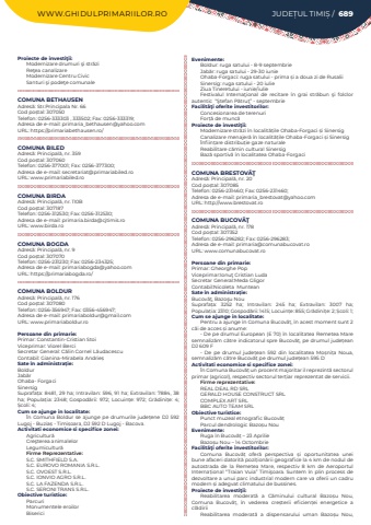 WWW.GHIDULPRIMARIILOR.RO JUDE%u021aUL TIMI%u0218 / 689Proiecte de investi%u0163ii:Modernizare drumuri %u015fi str%u0103ziRe%u0163ea canalizareModernizare Centru CivicSanturi %u015fi pode%u0163e comunaleCOMUNA BETHAUSENAdres%u0103: Str.Principala Nr. 66Cod po%u0219tal: 307050Telefon: 0256-333303 , 333502; Fax: 0256-333319; Adresa de e-mail: primaria_bethausen@yahoo.comURL: https://primariabethausen.ro/COMUNA BILEDAdres%u0103: Principal%u0103, nr. 359Cod po%u0219tal: 307060Telefon: 0256-377001; Fax: 0256-377300; Adresa de e-mail: secretariat@primariabiled.roURL: www.primariabiled.roCOMUNA BIRDAAdres%u0103: Principal%u0103, nr. 110BCod po%u0219tal: 307187Telefon: 0256-312530; Fax: 0256-312530; Adresa de e-mail: primaria.birda@cjtimis.roURL: www.birda.roCOMUNA BOGDAAdres%u0103: Principal%u0103, nr. 9Cod po%u0219tal: 307070Telefon: 0256-231230; Fax: 0256-234325; Adresa de e-mail: primariabogda@yahoo.comURL: https://primariabogda.ro/COMUNA BOLDURAdres%u0103: Principal%u0103, nr. 176Cod po%u0219tal: 307080Telefon: 0256-356947; Fax: 0356-456947; Adresa de e-mail: primariaboldur@gmail.comURL: www.primariaboldur.roPersoane din primarie:Primar: Constantin-Cristian Stoi%u00a0Viceprimar: Viorel Berci%u00a0Secretar General: C%u0103lin Cornel L%u0103udacescu%u00a0Contabil: Gianina-Mirabela Andrie%u0219Sate %u00een administra%u021bie:BoldurJab%u0103rOhaba- ForgaciSinersigSuprafa%u021ba:%u00a08481, 29 ha; Intravilan:%u00a0596, 91 ha; Extravilan:%u00a07884, 38 ha; Popula%u021bia:%u00a0 2348; Gospod%u0103rii:%u00a0 972; Locuin%u021be:%u00a0 972; Gr%u0103dini%u021be:%u00a0 4; %u0218coli:%u00a04; Cum se ajunge in localitate:%u00cen Comuna Boldur se ajunge pe drumurile jude%u021bene DJ 592 Lugoj - Buzia%u0219 - Timi%u0219oara, DJ 592 D Lugoj - Bacova.Activitati economice si specifice zonei:Agricultur%u0103Cre%u015fterea animalelorLegumicultur%u0103Firme Reprezentative:S.C. SMITHFIELD S.A.S.C. EUROVO ROMANIA S.R.L.S.C. OVOEST S.R.L.S.C. IONVIO AGRO S.R.L.S.C. LA FAZENDA S.R.L.S.C. SERONI TRANS S.R.L.Obiective turistice:ParcuriMonumentele eroilorBisericiEvenimente:Boldur: ruga satului - 8-9 septembrieJab%u0103r: ruga satului - 29-30 iunieOhaba-Forgaci: ruga satului - prima %u0219i a doua zi de RusaliiSinersig: ruga satului - 20 iulieZiua Tineretului - iunie/iulieFestivalul Interna%u0163ional de recitare %u00een grai str%u0103bun %u015fi folclor autentic%u00a0 %u201c%u015etefan P%u0103tru%u0163%u201d - septembrieFacilit%u00e3%u0163i oferite investitorilor:Concesionarea de terenuriFor%u021b%u0103 de munc%u0103Proiecte de investi%u0163ii:Modernizare str%u0103zi %u00een localit%u0103%u021bile Ohaba-Forgaci %u0219i SinersigCanalizare menajer%u0103 %u00een localit%u0103%u021bile Ohaba-Forgaci %u0219i Sinersig%u00cenfiin%u021bare distribu%u021bie gaze naturaleReabilitare c%u0103min cultural Sinersig Baz%u0103 sportiv%u0103 %u00een localitatea Ohaba-ForgaciCOMUNA BRESTOV%u0102%u0162Adres%u0103: Principal%u0103, nr. 20Cod po%u0219tal: 307085Telefon: 0256-231460; Fax: 0256-231460; Adresa de e-mail: primaria_brestovat@yahoo.comURL: http://www.brestovat.roCOMUNA BUCOV%u0102%u0162Adres%u0103: Principal%u0103, nr. 178Cod po%u0219tal: 307352Telefon: 0256-296282; Fax: 0256-296283; Adresa de e-mail: primaria@comunabucovat.roURL: www.comunabucovat.roPersoane din primarie:Primar: Gheorghe PopViceprimar:Ionu%u0163 Cristian LudaSecretar General:Meda GligorContabil:Nicoleta%u00a0 MunteanSate %u00een administra%u021bie:Bucov%u0103%u0163, Bazo%u015fu NouSuprafa%u021ba:%u00a0 3252 ha; Intravilan:%u00a0 245 ha; Extravilan:%u00a0 3007 ha; Popula%u021bia:%u00a02310; Gospod%u0103rii:%u00a01415; Locuin%u021be:%u00a0855; Gr%u0103dini%u021be:%u00a02; %u0218coli:%u00a01; Cum se ajunge in localitate:Pentru a ajunge %u00een Comuna Bucov%u0103%u021b, %u00een acest moment sunt 2 c%u0103i de acces %u0219i anume:-%u00a0De pe drumul European (E 70) %u00een localitatea Remetea Mare semnaliz%u0103m c%u0103tre indicatorul spre Bucov%u0103%u021b, pe drumul jude%u021bean DJ 609 F -%u00a0 De pe drumul jude%u021bean 592 din localitatea Mo%u0219ni%u021ba Noua, semnaliz%u0103m c%u0103tre Bucov%u0103%u021b pe drumul jude%u021bean 595 DActivitati economice si specifice zonei:%u00cen Comuna Bucov%u0103%u021b un procent majoritar il reprezint%u0103 sectorul primar (agricol), respectiv sectorul ter%u021biar reprezentat de servicii.Firme reprezentative:REAL DEAL RD SRLGERALD HOUSE CONSTRUCT SRLCOMPLEX ART SRLBBC AUTO TEAM SRLObiective turistice:Punct muzeal etnografic Bucov%u0103%u021bParcul dendrologic Bazo%u0219u NouEvenimente:Ruga %u00een Bucov%u0103%u021b %u2013 23 AprilieBazo%u0219u Nou %u2013 14 OctombrieFacilit%u00e3%u0163i oferite investitorilor:Comuna Bucov%u0103%u021b ofer%u0103 perspectiva %u0219i oportunitatea unei bune afaceri datorit%u0103 pozi%u021bion%u0103rii geografice la 4 km de nodul de autostrada de la Remetea Mare, respectiv 8 km de Aeroportul Interna%u021bional %u201cTraian Vuia%u201d Timi%u015foara. Suntem %u00een plin process de dezvoltare a unui parc industrial modern care va oferii un cadru modern %u0219i adegvat climatului de bussines.Proiecte de investi%u0163ii:Reabilitarea moderat%u0103 a C%u0103minului cultural Bazo%u0219u Nou, Comuna Bucov%u0103%u021b, %u00een vederea cre%u0219terii eficien%u021bei energetice a cl%u0103diriiReabilitarea moderat%u0103 a dispensarului uman Bazo%u0219u Nou,