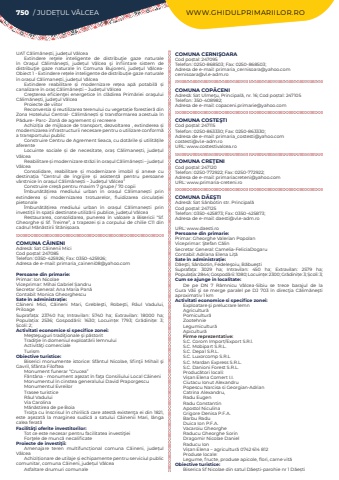 UAT C%u0103lim%u0103ne%u0219ti, jude%u021bul V%u00e2lceaExtindere re%u0163ele inteligente de distribu%u0163ie gaze naturale %u00een Ora%u015ful C%u0103lim%u0103ne%u015fti, jude%u021bul V%u1eadlcea %u015fi %u00eenfiintare sistem de distribu%u0163ie gaze naturale %u00een Comuna Bujoreni, jude%u0163ul V%u1eadlceaObiect 1 - Extindere re%u021bele inteligente de distribu%u021bie gaze naturale %u00een ora%u0219ul C%u0103limane%u0219ti, jude%u021bul V%u00e2lceaExtindere reabilitare %u0219i modernizare re%u021bea ap%u0103 potabil%u0103 %u0219i canalizare %u00een ora%u0219 C%u0103lim%u0103ne%u0219ti %u2013 Jude%u021bul V%u00e2lceaCre%u015fterea eficien%u0163ei energetice %u00een cl%u0103direa Prim%u0103riei ora%u015fului C%u0103lim%u0103ne%u0219ti, jude%u0163ul V%u00e2lceaProiecte de viitorReconversia %u0219i reutilizarea terenului cu vegeta%u021bie forestier%u0103 din Zona Hotelului Central- C%u0103lim%u0103ne%u0219ti %u0219i transformarea acestuia %u00een P%u0103dure- Parc- Zon%u0103 de agrement %u0219i recreereAchizi%u021bia de mijloace de transport, dezvoltarea , extinderea %u0219i modernizarea infrastructurii necesare pentru o utilizare conform%u0103 a transportului publicConstruire Centru de Agrement Seaca, cu dot%u0103rile %u0219i utilit%u0103%u021bile aferenteLocuinte sociale %u0219i de necesitate, ora%u0219%u00a0 C%u0103limane%u0219ti, jude%u021bul V%u00e2lceaReabilitare %u0219i modernizare str%u0103zi %u00een ora%u0219ul C%u0103lim%u0103ne%u0219ti %u2013 jude%u021bul V%u00e2lceaConsolidare, reabilitare %u0219i modernizare imobil %u0219i anexe cu destina%u021bia %u201dCentrul de %u00eengrijire %u0219i asisten%u021b%u0103 pentru persoane v%u00e2rstnice %u00een ora%u0219ul C%u0103lim%u0103ne%u0219ti %u2013 Jude%u021bul V%u00e2lcea%u201dConstruire cre%u0219%u0103%u00a0pentru maxim 7 grupe / 70 copii%u00cembun%u0103t%u0103%u021birea mediului urban %u00een ora%u0219ul C%u0103limane%u0219ti prin extinderea %u0219i modernizarea trotuarelor, fluidizarea circula%u021biei pietonale%u00cembun%u0103t%u0103%u021birea mediului urban %u00een ora%u0219ul C%u0103limane%u0219ti prin investi%u021bii %u00een spa%u021bii destinate utiliz%u0103rii publice, jude%u021bul V%u00e2lcea Restaurarea, consolidarea, punerea %u00een valoare a Bisericii %u201cSf. Gheorghe %u0219i Sf. Treime%u201d, a trapezei %u0219i a corpului de chilie C11 din cadrul M%u0103n%u0103stirii St%u0103ni%u0219oara.COMUNA C%u00c2INENIAdres%u0103: Sat C%u00e2inenii MiciCod po%u0219tal: 247085Telefon: 0350-425926; Fax: 0350-425926; Adresa de e-mail: primaria_caineni08@yahoo.comPersoane din primarie:Primar: Ion NicolaeViceprimar: Mihai Gabriel %u0218andruSecretar General: Ana Maria Pan%u0103Contabil: Monica GheorghescuSate %u00een administra%u021bie:C%u00e2ineni Mici, C%u00e2ineni Mari, Greble%u015fti, Robe%u015fti, R%u00e2ul Vadului, PriloageSuprafa%u021ba:%u00a0 23740 ha; Intravilan:%u00a0 5740 ha; Extravilan:%u00a0 18000 ha; Popula%u021bia:%u00a0 2536; Gospod%u0103rii:%u00a0 1630; Locuin%u021be:%u00a0 1793; Gr%u0103dini%u021be:%u00a0 3; %u0218coli:%u00a02; Activitati economice si specifice zonei:Me%u015fte%u015fuguri tradi%u0163ionale %u015fi p%u0103storitTradi%u0163ie %u00een domeniul exploat%u0103rii lemnuluiActivit%u0103%u0163i comercialeTurismObiective turistice:Biserici monumente istorice: Sf%u00e2ntul Nicolae, Sfin%u0163ii Mihail %u015fi Gavril, Sf%u00e2nta FilofteaMonument funerar %u201cCrucea%u201dF%u00e2nt%u00e2na - monument a%u015fezat %u00een fa%u0163a Consiliului Local C%u00e2ineniMonumentul %u00een cinstea generalului David PraporgescuMonumentul EvreilorTrasee turisticeR%u00e2ul VaduluiVia CarolinaM%u0103n%u0103stirea de pe BoiaTroi%u0163a cu %u00eenscrisul %u00een chirilic%u0103 care atest%u0103 existen%u0163a ei din 1821, este a%u015fezat%u0103 la marginea sudic%u0103 a satului C%u00e2inenii Mari, l%u00e2nga calea ferat%u0103Facilit%u00e3%u0163i oferite investitorilor:Tot ce este necesar pentru facilitatea investi%u0163ieiFor%u0163ele de munc%u0103 necalificateProiecte de investi%u0163ii:Amenajare teren multifunc%u021bional comuna C%u00e2ineni, jude%u021bul V%u00e2lceaAchizi%u021bionare de utilaje %u0219i echipamente pentru serviciul public comunitar, comuna C%u00e2ineni, jude%u021bul V%u00e2lceaAsfaltare drumuri comunaleCOMUNA CERNI%u015eOARACod po%u0219tal: 247095Telefon: 0250-868503; Fax: 0250-868503; Adresa de e-mail: primaria_cernisoara@yahoo.comcernisoara@vl.e-adm.roCOMUNA COP%u0102CENIAdres%u0103: Sat Ulme%u0163u, Principal%u0103, nr. 16; Cod po%u0219tal: 247105Telefon: 350-408982; Adresa de e-mail: copaceni.primarie@yahoo.comCOMUNA COSTE%u015eTICod po%u0219tal: 247115Telefon: 0250-863330; Fax: 0250-863330; Adresa de e-mail: primaria_costesti@yahoo.comcostesti@vl.e-adm.roURL: www.costestivalcea.roCOMUNA CRE%u0162ENICod po%u0219tal: 247120Telefon: 0250-772922; Fax: 0250-772922; Adresa de e-mail: primariacreteni@yahoo.comURL: www.primaria-creteni.roCOMUNA D%u0102E%u015eTIAdres%u0103: Sat S%u00e2nbotin str. Principal%u0103Cod po%u0219tal: 247125Telefon: 0350-425873; Fax: 0350-425873; Adresa de e-mail: daesti@vl.e-adm.roURL: www.daesti.roPersoane din primarie:Primar:%u00a0Gheorghe Valerian PopolanViceprimar: %u015etefan C%u0103linSecretar General: Camelia-FeliciaDogaruContabil: Adriana Elena Li%u021b%u0103Sate %u00een administra%u021bie:D%u0103e%u015fti, S%u00e2nbotin, Fedele%u015foiu, B%u0103bue%u015ftiSuprafa%u021ba:%u00a0 3029 ha; Intravilan:%u00a0 450 ha; Extravilan:%u00a0 2579 ha; Popula%u021bia:%u00a02844; Gospod%u0103rii:%u00a01080; Locuin%u021be:%u00a02300; Gr%u0103dini%u021be:%u00a03; %u0218coli:%u00a03; Cum se ajunge in localitate:De pe DN 7 R%u00e2mnicu V%u00e2lcea-Sibiu se trece barajul de la Gura V%u0103ii %u015fi se merge paralel pe DJ 703 %u00een direc%u0163ia C%u0103lim%u0103ne%u015fti aproximativ 1 kmActivitati economice si specifice zonei:Exploatare %u015fi prelucrare lemnAgricultur%u0103Pomicultur%u0103ZootehnieLegumicultur%u0103Apicultur%u0103 Firme reprezentative:S.C. Corom Import/Export S.R.l.S.C. Mobipa