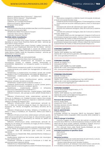 WWW.GHIDULPRIMARIILOR.RO JUDE%u021aUL VRANCEA / 769Biserica %u201eNa%u0219terea Maicii Domnului%u201d %u2013 (S%u0103punari)Biserica %u201eSfin%u021bii Voievozi%u201d %u2013 (Stamatine%u0219ti)Biserica %u201cSf%u00e2ntul Nicolae Nou%u201dCatedrala %u201eSf. Cuvioas%u0103 Parascheva%u201dBiserica Armean%u0103 %u201eSf%u00e2nta Maria%u201d Sinagoga %u201cAhai Vereai%u201dEvenimente:Evenimentele prilejuite de s%u0103rb%u0103torirea Zilei Unirii Principatelor Rom%u00e2ne de la 24 ianuarie 1859S%u0103rb%u0103toarea Zilelor Municipiului Foc%u0219aniFestivalul Viei %u0219i Vinului %u201dBachus%u201d Festivalul %u201eFlorentin Delmar%u201dFacilit%u00e3%u0163i oferite investitorilor:LOCALIT%u0102%u021aILE %u00ceNFR%u0102%u021aITEAcord de %u00eenfr%u0103%u021bire %u00eentre ora%u0219ul Foc%u0219ani, jude%u021bul Vrancea din Rom%u00e2nia %u0219i ora%u0219ul Tivoli, Provincia Roma din Italia - semnat pe 25.01.2012 %u00een ora%u0219ul Foc%u0219ani Acord de %u00eenfr%u0103%u021bire %u00eentre ora%u0219ul Foc%u0219ani, jude%u021bul Vrancea din Rom%u00e2nia %u0219i ora%u0219ul Majdanpek, districtul Bor din Serbia - semnat pe 01.05.2017 %u00een ora%u0219ul Majdanpek 3. Acord de %u00eenfr%u0103%u021bire %u00eentre Municipiul Foc%u015fani, Jude%u021bul Vrancea din Rom%u00e2nia %u0219i Ora%u015ful %u015etefan Vod%u0103, Raionul %u015etefan Vod%u0103 din Republica Moldova - semnat pe 06.07.2022 %u00een ora%u0219ul Foc%u0219ani.Proiecte de investi%u0163ii:PROIECTE %u00ceN CURS DE IMPLEMENTAREPROIECTE FINAN%u021aATE PRIN POR ( finalizare 2024 )Resistematizarea infrastructurii de transport la nivelul municipiului Foc%u0219ani %u00een vederea cre%u0219terii atractivit%u0103%u021bii %u0219i accesibilit%u0103%u021bii deplas%u0103rilor cu transportul public, cu bicicleta %u0219i pietonaleModernizarea transportului public %u00een municipiul Foc%u0219aniImplementarea unui sistem de management al traficului %u0219i monitorizareReabilitarea %u0219i modernizarea locuin%u021belor sociale din strada Revolu%u021biei nr. 16 %u0219i 17 %u0219i amenajarea unor spa%u021bii de agreementReabilitarea, modernizarea %u0219i extinderea Sistemului de iluminat publicCrearea unui Centru Multifunc%u021bional pentru activit%u0103%u021bi educative, culturale, recreative %u0219i socialeReabilitarea, modernizarea %u0219i dotarea Cre%u0219ei nr. 1Cre%u0219terea performan%u021bei energetice %u0219i lucr%u0103ri conexe pentru cl%u0103direa internat a Liceului cu program sportivReabilitarea , modernizarea cl%u0103dirilor %u0219i echiparea infrastructurii educa%u021bionale a Gr%u0103dini%u021bei nr. 1PROIECTE FINANTATE PRIN PNI %u2013 Anghel Saligny ( 2023-2026)Refacere trotuare , alei, parcaje %u0219i covor asfaltic strada Mare a UniriiRefacere infrastructur%u0103 str%u0103zi, sistematizare vertical%u0103 str. Timi%u0219, str. N. B%u0103lcescu, str. Predeal (tronson cuprins %u00eentre strada Ion Creang%u0103 %u0219i Grigore Ionescu) %u0219i repara%u021bii si a%u0219ternere covoare asfaltice carosabil str.Magazia G%u0103riiRefacere infrastructur%u0103 str%u0103zi, sistematizare vertical%u0103 str. Prof. C. Stere, str. Ecaterina Varga, str. Bujor, str. Agriculturii, str.Mure%u0219ului, str. Cernei, str.Dog%u0103riei, str.Cri%u0219ana, str.Greva de la Grivi%u021baRefacere infrastructur%u0103 str.Alecu Sihleanu %u0219i fund%u0103tura, str.Maior G. Son%u021bu %u0219i fund%u0103tura, str. Aviatorilor, Aleea Cuza Vod%u0103 %u0219i fund%u0103turaRefacere infrastructur%u0103 str%u0103zi, sistematizare vertical%u0103, parc%u0103ri, spa%u021bii verzi %u0219i accese pentru str. N. Iorga, str. Oituz (tronson cuprins %u00eentre str. M%u0103r%u0103%u0219ti %u0219i str. D. Zamfirescu), str. Miori%u021ba, str. %u0218tefan cel Mare, str.Eroilor, str.V%u0103miiRefacere infrastructur%u0103 str%u0103zi, sistematizare vertical%u0103 str. F%u0103g%u0103ra%u0219, str. Gh. Potop, str. Ghioceilor, str.Arge%u0219, str.Dinicu Golescu, str.Zorilor, P-%u021ba VictorieiRefacere infrastructur%u0103 stradal%u0103 %u0219i parc%u0103ri adiacente str%u0103zilor Maior Gh. Pastia, M. Kog%u0103lniceanu, D. Cantemir, Cuza Vod%u0103 - PT8Extindere re%u021bea de distribu%u021bie gaze naturale %u00een cartier M%u00e2ndre%u0219tiPROIECTE CU FINANTARE PRIN ADMINISTRATIA FONDULUI PENTRU MEDIUModernizarea sistemului de iluminat public din Municipiul Foc%u0219ani (AFM) etapa IIAmplasare, montare %u0219i punere %u00een func%u021biune a 5 sta%u021bii de re%u00eenc%u0103rcare ma%u0219ini electrice (AFM)PROIECTE CU FINAN%u021aARE PRIN PNRRCre%u0219terea eficien%u021bei energetice a cl%u0103dirii Prim%u0103riei Municipiului Foc%u0219aniRenovarea energetic%u0103 a cl%u0103dirilor %u0218colii Gimnaziale Al.Vlahu%u021b%u0103 %u0219i %u0218colii Gimnaziale Nicolae IorgaCre%u0219terea performan%u021bei energetice a Cinematografului UnireaConstruirea de locuin%u021be nZEB plus pentru tineri %u00een Municipiul Foc%u0219ani%u00cenfiin%u021barea de centre de colectare prin aport voluntarAchizi%u021bia de autobuze ecologice, sta%u021bii de %u00eenc%u0103rcare %u0219i sisteme asociateAchizi%u021bia de autobuze ecologice, sta%u021bii de %u00eenc%u0103rcare %u0219i sisteme asociate -etapa a II aExtinderea sistemului de management integrat al traficului %u0219i prioritizarea transportului public, inclusiv m%u0103suri de monitorizare a parametrilor de mediu %u0219i reducerea polu%u0103rii Extinderea sistemului de management integrat al traficului %u0219i prioritizarea transportului public, inclusiv m%u0103suri de monitorizare a parametrilor de mediu %u0219i reducerea polu%u0103rii etapa a II aCOMUNA GAROAFACod po%u0219tal: 627140Telefon: 0237-263805; Fax: 0237-263881; Adresa de e-mail: primaria_garoafa_vrancea@yahoo.comURL: www.garoafa.primarievn.roCOMUNA GOLE%u015eTIAdres%u0103: str.Cotesti, nr. 2Cod po%u0219tal: 627150Telefon: 0237-212989; Fax: 0237-212989; Adresa de e-mail: comunagolesti@yahoo.comURL: www.primariagolesti.roCOMUNA GOLOGANUAdres%u0103: Tinere%u0163ii, nr. 9Cod po%u0219tal: 627206Telefon: 0237-