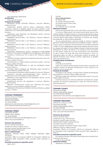 Situl arheologic V%u00e2j%u00e2itoareaEvenimente:Pie%u021be agroalimentareProiecte de investi%u0163ii:Reabilitare %u0218coala General%u0103%u00a0 T%u0103t%u0103ranu, comuna T%u0103t%u0103ranu, jude%u021bul VranceaModificarea solu%u021biei tehnice pentru reabilitarea cl%u0103dirii c%u0103minului cultural %u00een vederea alipirii pe latura nordic%u0103 a unei construc%u021bii noi cu destina%u021bia bibliotec%u0103, comuna T%u0103t%u0103ranu, jude%u021bul VranceaReabilitare Cas%u0103%u00a0 Parohial%u0103, sat Bordeasca Veche, comuna T%u0103t%u0103ranu, jude%u021bul VranceaReabilitare termic%u0103 Bloc 1 sat T%u0103t%u0103ranu, comuna T%u0103t%u0103ranu, jude%u021bul Vrancea Reabilitare termic%u0103 Bloc 2 sat T%u0103t%u0103ranu, comuna T%u0103t%u0103ranu, jude%u021bul VranceaReabilitare termic%u0103 Bloc 3 sat T%u0103t%u0103ranu, comuna T%u0103t%u0103ranu, jude%u021bul VranceaReabilitare termic%u0103 Bloc 4 sat T%u0103t%u0103ranu, comuna T%u0103t%u0103ranu, jude%u021bul VranceaAsigurarea infrastructurii pentru transportul verde-ITS/alte infrastrucuri TIC( sisteme inteligente de management urban/local)Investi%u021bii %u00een infrastrucuri TIC %u00een cadrul UAT T%u0103t%u0103ranu, jude%u021bul VranceaAchizi%u021bie microbuz nepoluant %u0219i sta%u021bie de %u00eenc%u0103rcare %u00een Comuna T%u0103t%u0103ranu, jude%u021bul VranceaEficientizarea %u0219i modernizarea iluminatului public, comuna T%u0103t%u0103ranu, jude%u021bul Vrancea%u00cenfiin%u021bare re%u021bea alimentare cu ap%u0103%u00a0 sat Bordeasca Nou%u0103, comuna T%u0103t%u0103ranu%u00cenfiin%u021bare sistem inteligent de distribu%u021bie gaze naturale %u00een comuna T%u0103t%u0103ranu, jude%u021bul VranceaBran%u0219amente canalizare institu%u021bii publice %u00een comuna T%u0103t%u0103ranuConstruire locuin%u021be sociale,amenajare teren, parcare %u0219i %u00eemprejmuire, comuna T%u0103t%u0103ranu, jude%u021bul VranceaReabilitare Casa%u00a0 Specialistului, sat Bordeasca Veche, cmuna T%u0103t%u0103ranu, jude%u021bul VranceaModernizare drumuri de exploatare %u00een comuna T%u0103t%u0103ranu, jude%u021bul VranceaRefacere infrastructur%u0103%u00a0 rutier%u0103%u00a0 prin a%u0219ternere de mixturi asfaltice %u00een comuna T%u0103t%u0103ranu,jude%u021bul VranceaReabilitare infrastructura rutier%u0103%u00a0%u00een comuna T%u0103t%u0103ranu, jude%u021bul Vrancea %u2013 ETAPA ICOMUNA T%u00c2MBOE%u015eTIAdres%u0103: Comuna TimboestiCod po%u0219tal: 627355Telefon: 0237-256105; Fax: 0237-256105; Adresa de e-mail: primaria_timboesti@yahoo.comURL: https://tamboesti.primarievn.ro/COMUNA TIFE%u015eTICod po%u0219tal: 627375Telefon: 0237- 269500; Fax: 0237-269500; Adresa de e-mail: primaria.tifesti@yahoo.comURL: www.primariatifesti.roPersoane din primarie:Primar: Gabriel%u00a0Postolache%u00a0Viceprimar: Adrian Virginel%u00a0Gur%u0103u%u00a0Secretar General: Roxana-Elena%u00a0%u00a0Ifrim%u00a0Contabil: Verginel%u00a0Pot%u00eerniche%u00a0Sate %u00een administra%u021bie:Clipice%u0219ti, Vit%u0103ne%u0219ti, S%u00e2rbi, Tife%u015fti, Ole%u015fe%u015fti, B%u0103tine%u0219ti,%u00a0 Ige%u015fti, P%u0103tr%u0103%u015fcaniSuprafa%u021ba:%u00a0 7887 ha; Intravilan:%u00a0 668.75 ha; Extravilan:%u00a0 7218.25 ha; Popula%u021bia:%u00a0 5099; Gospod%u0103rii:%u00a0 1920; Locuin%u021be:%u00a0 2222; Gr%u0103dini%u021be:%u00a0 5; %u0218coli:%u00a03; Activitati economice si specifice zonei:Agricultur%u0103Comer%u021bFirme reprezentative:SC Natura SRLSC Viorelo Intenational SRLSC Prest%u0103ri Servicii Marco SRLProduse locale: Vin , legume, sucuri naturaleObiective turistice:Pensiunea Domeniile Panciu, din satul S%u00e2rbi, comuna %u021aife%u0219ti%u00cen comuna %u021aife%u0219ti exist%u0103 mai multe monumente istorice care vorbesc despre tradi%u021biile acestui loc. Exist%u0103 de asemenea %u0219i dou%u0103 situri arheologice: a%u0219ezarea medieval%u0103 din secolele XIV%u2013XVIII aflat%u0103 la limita dintre satele Ige%u0219ti %u0219i Batine%u0219ti %u0219i cimitirul din aceea%u0219i perioad%u0103 aflat %u00een centrul satului Batine%u0219tiTot pe administrativul comunei exist%u0103 %u0219i cimitirul osta%u0219ilor germani. Acesta este situat pe drumul jude%u021bean Foc%u0219ani %u2013 Panciu, %u00een locul numit %u201eFrunzoaia%u201d. A fost construit %u00een anul 1924 %u0219i restaurat %u00een 1994. Cimitirul ad%u0103poste%u0219te osemintele osta%u0219ilor germani c%u0103zu%u021bi pe c%u00e2mpul de lupt%u0103 %u00een Primul R%u0103zboi Mondial. Monumentul este %u00eemprejmuit cu ziduri de piatr%u0103, iar la intrare se afl%u0103 un fronton tot din piatr%u0103. Sutele de cruci ale mormintelor sunt delimitate %u00een patru careuri de dou%u0103 alei largi care formeaz%u0103 o cruce. La intersec%u021bia aleilor se afl%u0103 un monument funerar de piatr%u0103. Pe pietrele funerare sunt %u00eenscrise numele, regimentul %u0219i gradele celor %u00eenmorm%u00e2nta%u021bi aiciFacilit%u00e3%u0163i oferite investitorilor:Utilit%u0103%u021biFor%u021b%u0103 de munc%u0103 ieftin%u0103Suport din partea administra%u021biei locale pentru proiectele de investi%u021bii menite s%u0103 dezvolte infrastructura zonei noastre %u0219i s%u0103 creeze noi locuri de munc%u0103Proiecte de investi%u0163ii:Extindere surse captare, %u00eenmagazinare %u0219i Re%u021bele de distribu%u021bie ap%u0103 potabil%u0103 %u00een comuna Tife%u0219ti, jude%u021bul Vrancea%u00cenfiin%u021bare sistem de colectare %u0219i tratare ape uzate %u00een comuna Tife%u0219ti, judetul Vrancea%u00cennoirea parcului de vehicule destinate transportului public (achizi%u021bia de vehicule nepoluante) %u0219i sta%u021bii de %u00eenc%u0103rcare pentru vehicule electriceCOMUNA TULNICICod po%u0219tal: 627365Telefon: 0237-265312, 265426; Fax: 0237-265312, 265426; Adresa de e-mail: primarie_tulnici@yahoo.comCOMUNA URECHE%u015eTIAdres%u0103: Str. Crinului nr. 228Cod po%u0219tal: 627385Telefon: 0237-251008, 251204; Fax: 0237-251008; Adresa de e-mail: primariaurechesti@yahoo.comURL: www.primariaurechesti.roPersoane din primarie:Pr