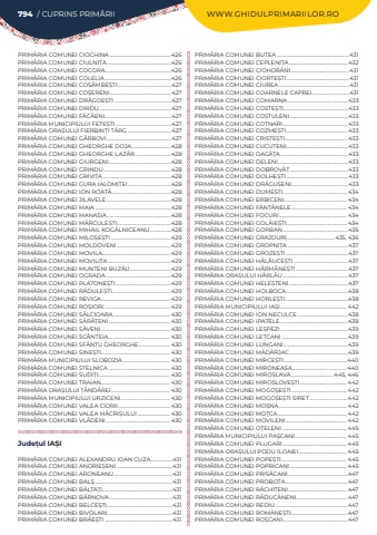 794 / CUPRINS PRIM%u0102RII WWW.GHIDULPRIMARIILOR.ROPRIM%u00c3RIA COMUNEI CIOCHINA...................................................426PRIM%u00c3RIA COMUNEI CIULNI%u021aA .....................................................426PRIM%u00c3RIA COMUNEI COCORA.......................................................426PRIM%u00c3RIA COMUNEI COLELIA.......................................................426PRIM%u00c3RIA COMUNEI COS%u00c2MBE%u0218TI............................................427PRIM%u00c3RIA COMUNEI CO%u0218ERENI...................................................427PRIM%u00c3RIA COMUNEI DR%u00c3GOE%u0218TI ...............................................427PRIM%u00c3RIA COMUNEI DRIDU............................................................427PRIM%u00c3RIA COMUNEI F%u00c3C%u00c3ENI.......................................................427PRIM%u00c3RIA MUNICIPIULUI FETE%u0218TI..............................................427PRIM%u00c3RIA ORA%u0218ULUI FIERBIN%u021aI T%u00c2RG ....................................427PRIM%u00c3RIA COMUNEI G%u00c2RBOVI .....................................................427PRIM%u00c3RIA COMUNEI GHEORGHE DOJA.................................428PRIM%u00c3RIA COMUNEI GHEORGHE LAZ%u00c3R..............................428PRIM%u00c3RIA COMUNEI GIURGENI....................................................428PRIM%u00c3RIA COMUNEI GRINDU........................................................428PRIM%u00c3RIA COMUNEI GRIVI%u021aA.........................................................428PRIM%u00c3RIA COMUNEI GURA IALOMI%u021aEI....................................428PRIM%u00c3RIA COMUNEI ION ROAT%u00c3.................................................428PRIM%u00c3RIA COMUNEI JILAVELE......................................................428PRIM%u00c3RIA COMUNEI MAIA...............................................................428PRIM%u00c3RIA COMUNEI MANASIA.....................................................428PRIM%u00c3RIA COMUNEI M%u00c3RCULE%u0218TI.............................................428PRIM%u00c3RIA COMUNEI MIHAIL KOG%u00c3LNICEANU..................428PRIM%u00c3RIA COMUNEI MILO%u0218E%u0218TI..................................................429PRIM%u00c3RIA COMUNEI MOLDOVENI.............................................429PRIM%u00c3RIA COMUNEI MOVILA.........................................................429PRIM%u00c3RIA COMUNEI MOVILI%u021aA.....................................................429PRIM%u00c3RIA COMUNEI MUNTENI BUZ%u00c3U..................................429PRIM%u00c3RIA COMUNEI OGRADA ......................................................429PRIM%u00c3RIA COMUNEI PLATONE%u0218TI..............................................429PRIM%u00c3RIA COMUNEI R%u00c3DULE%u0218TI.................................................429PRIM%u00c3RIA COMUNEI REVIGA..........................................................429PRIM%u00c3RIA COMUNEI RO%u0218IORI .......................................................429PRIM%u00c3RIA COMUNEI S%u00c3LCIOARA............................................... 430PRIM%u00c3RIA COMUNEI S%u00c3R%u00c3%u021aENI................................................... 430PRIM%u00c3RIA COMUNEI S%u00c3VENI......................................................... 430PRIM%u00c3RIA COMUNEI SC%u00c2NTEIA................................................... 430PRIM%u00c3RIA COMUNEI SF%u00c2NTU GHEORGHE.......................... 430PRIM%u00c3RIA COMUNEI SINE%u0218TI......................................................... 430PRIM%u00c3RIA MUNICIPIULUI SLOBOZIA....................................... 430PRIM%u00c3RIA COMUNEI STELNICA ................................................... 430PRIM%u00c3RIA COMUNEI SUDI%u021aI........................................................... 430PRIM%u00c3RIA COMUNEI TRAIAN......................................................... 430PRIM%u00c3RIA ORA%u0218ULUI %u021a%u00c3ND%u00c3REI................................................. 430PRIM%u00c3RIA MUNICIPIULUI URZICENI......................................... 430PRIM%u00c3RIA COMUNEI VALEA CIORII........................................... 430PRIM%u00c3RIA COMUNEI VALEA M%u00c3CRI%u0218ULUI........................... 430PRIM%u00c3RIA COMUNEI VL%u00c3DENI..................................................... 430Jude%u021bul IA%u0218IPRIM%u00c3RIA COMUNEI ALEXANDRU IOAN CUZA..................431PRIM%u00c3RIA COMUNEI ANDRIE%u0218ENI ..............................................431PRIM%u00c3RIA COMUNEI ARONEANU................................................431PRIM%u00c3RIA COMUNEI BAL%u0218 ................................................................431PRIM%u00c3RIA COMUNEI B%u00c3L%u021aA%u021aI..........................................................431PRIM%u00c3RIA COMUNEI B%u00c2RNOVA ....................................................431PRIM%u00c3RIA COMUNEI BELCE%u0218TI......................................................431PRIM%u00c3RIA COMUNEI BIVOLARI......................................................431PRIM%u00c3RIA COMUNEI BR%u00c3E%u0218TI ........................................................431PRIM%u00c3RIA COMUNEI BUTEA ............................................................431PRIM%u00c3RIA COMUNEI CEPLENI%u021aA.................................................432PRIM%u00c3RIA COMUNEI CIOHOR%u00c3NI................................................431PRIM%u00c3RIA COMUNEI CIORTE%u0218TI....................................................431PRIM%u00c3RIA COMUNEI CIUREA ..........................................................431PRIM%u00c3RIA COMUNEI COARNELE CAPREI...............................431PRIM%u00c3RIA COMUNEI COMARNA..................................................433PRIM%u00c3RIA COMUNEI COSTE%u0218TI.....................................................433PRIM%u00c3RIA COMUNEI CO%u0218TULENI................................................433PRIM%u00c3RIA COMUNEI COTNARI..........................................